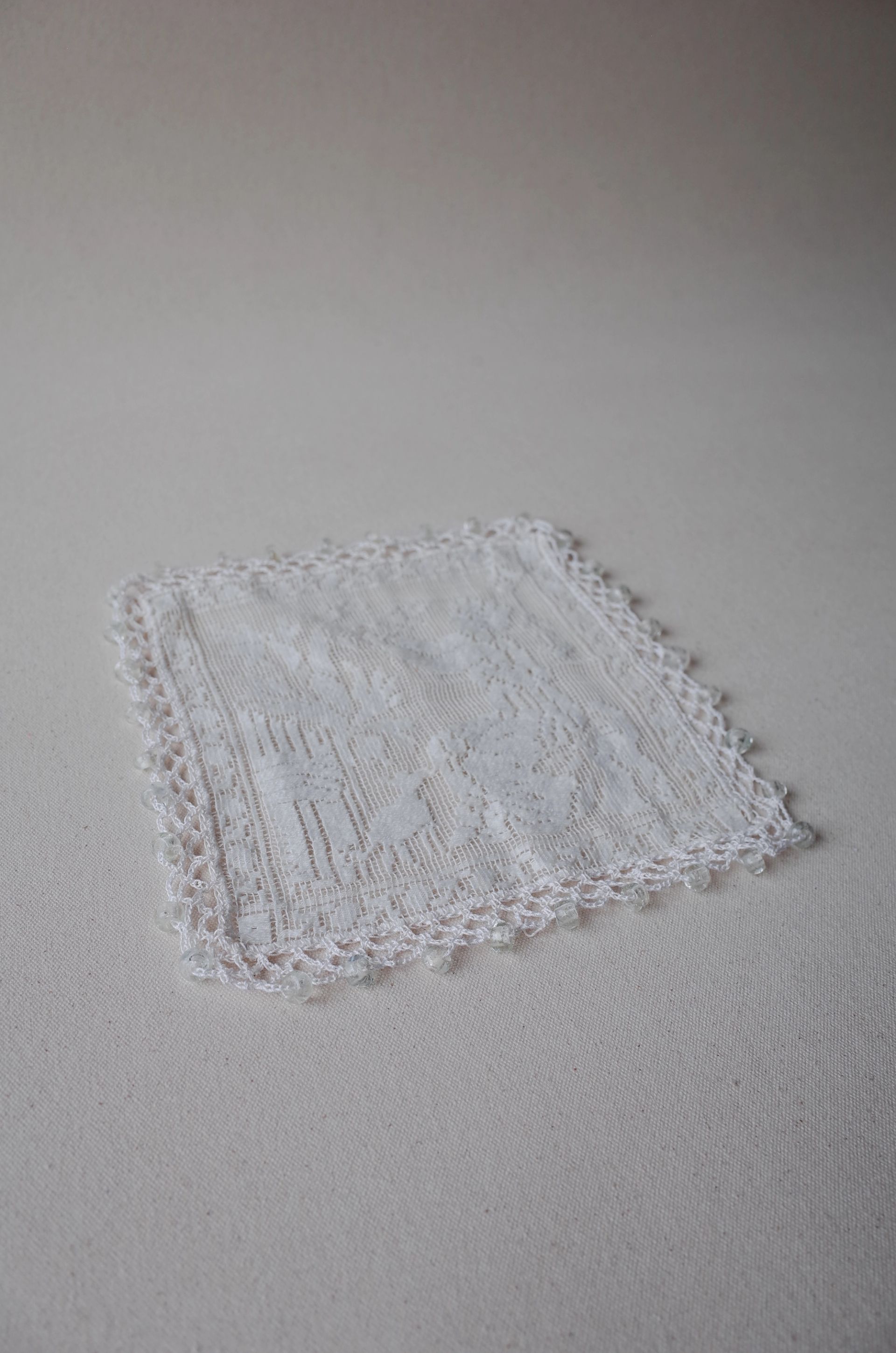 Vintage doily featuring a figurative design of a lady with an animal companion tending to her garden. The central motif is intricately woven, showcasing a serene scene that reflects pastoral elegance. The edges are hand-crocheted with fine craftsmanship and embellished with clear glass beads.