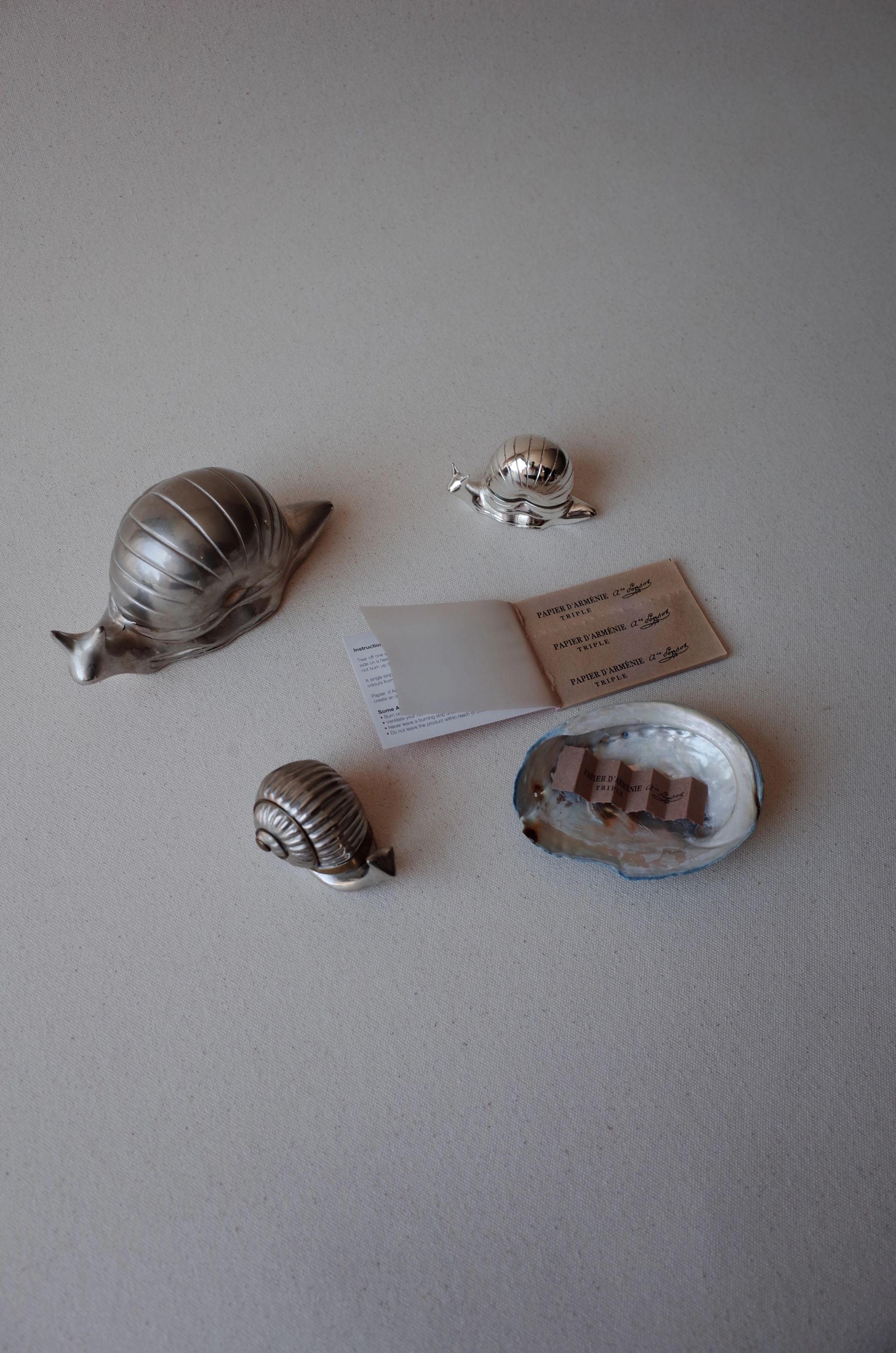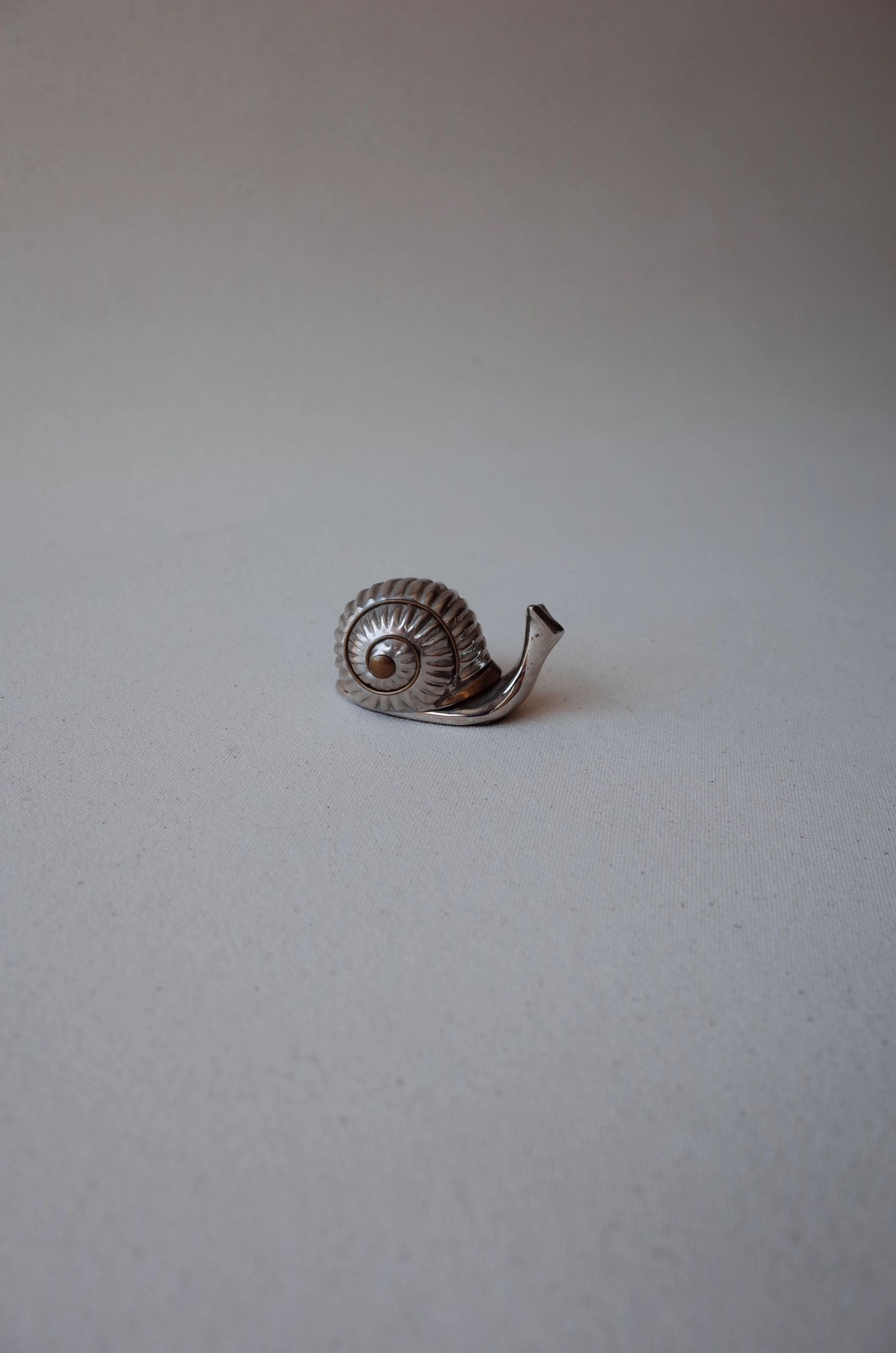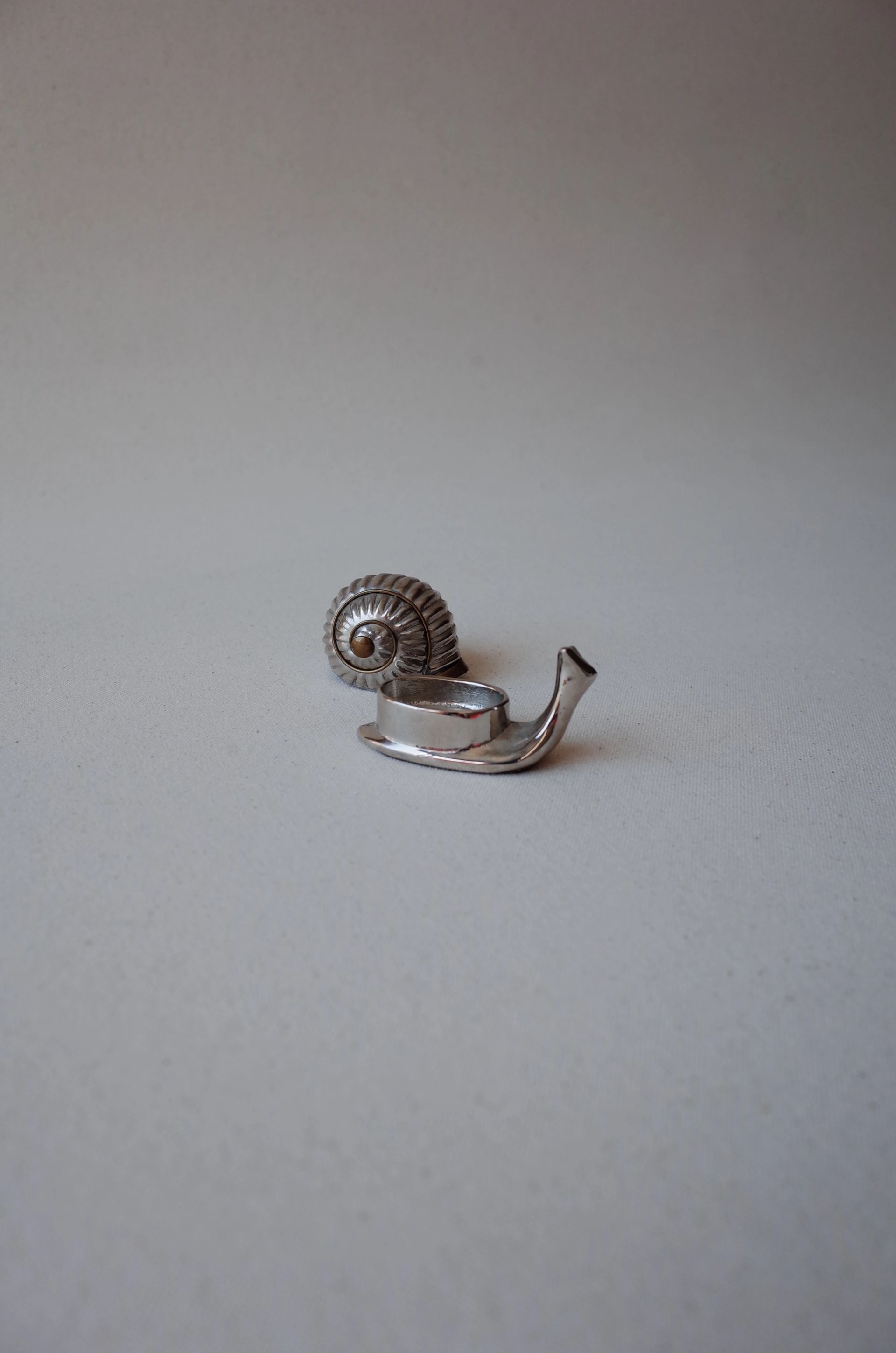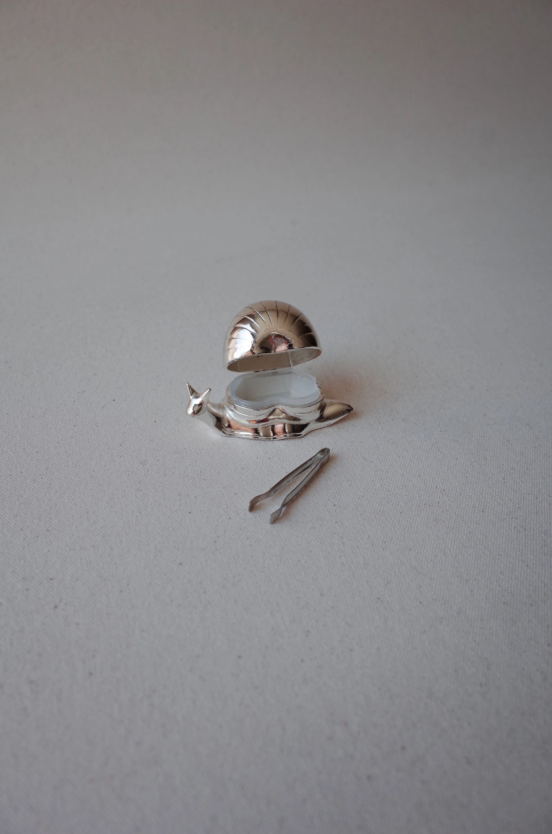 Snail-shaped pill box with tongs, complete with its original box. In excellent condition—this vintage/antique piece has no defects but may show minor signs of use.
